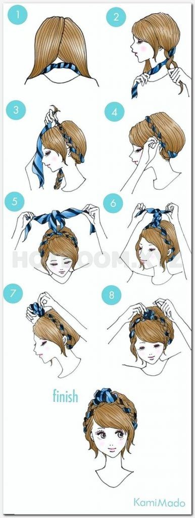 Séparez les cheveux en 2 sections à l’aide d’une raie. Je laisse libre cours à votre imagination pour personnaliser cette coiffure, une raie droite, sur le côté, en zigzag en fonction de la morphologie de votre visage (rond, ovale, carré, diamant, rectangle, triangle, cœur). Placez le foulard sur la nuque. Tressez les cheveux avec le foulard de chaque côté. Vous pouvez maintenir avec un élastique à la base pour vous aider. A la fin de la tresse attachez avec un élastique. Recommencez chaque étape pour l’autre côté. Puis nouez le foulard au sommet du crâne ou décalez le légèrement sur le côté pour une coiffure asymétrique maintenez le grâce à une rosette, double nœuds, macaron. Pour plus de détails sur le tuto coiffure, vous trouverez des illustrations ici.