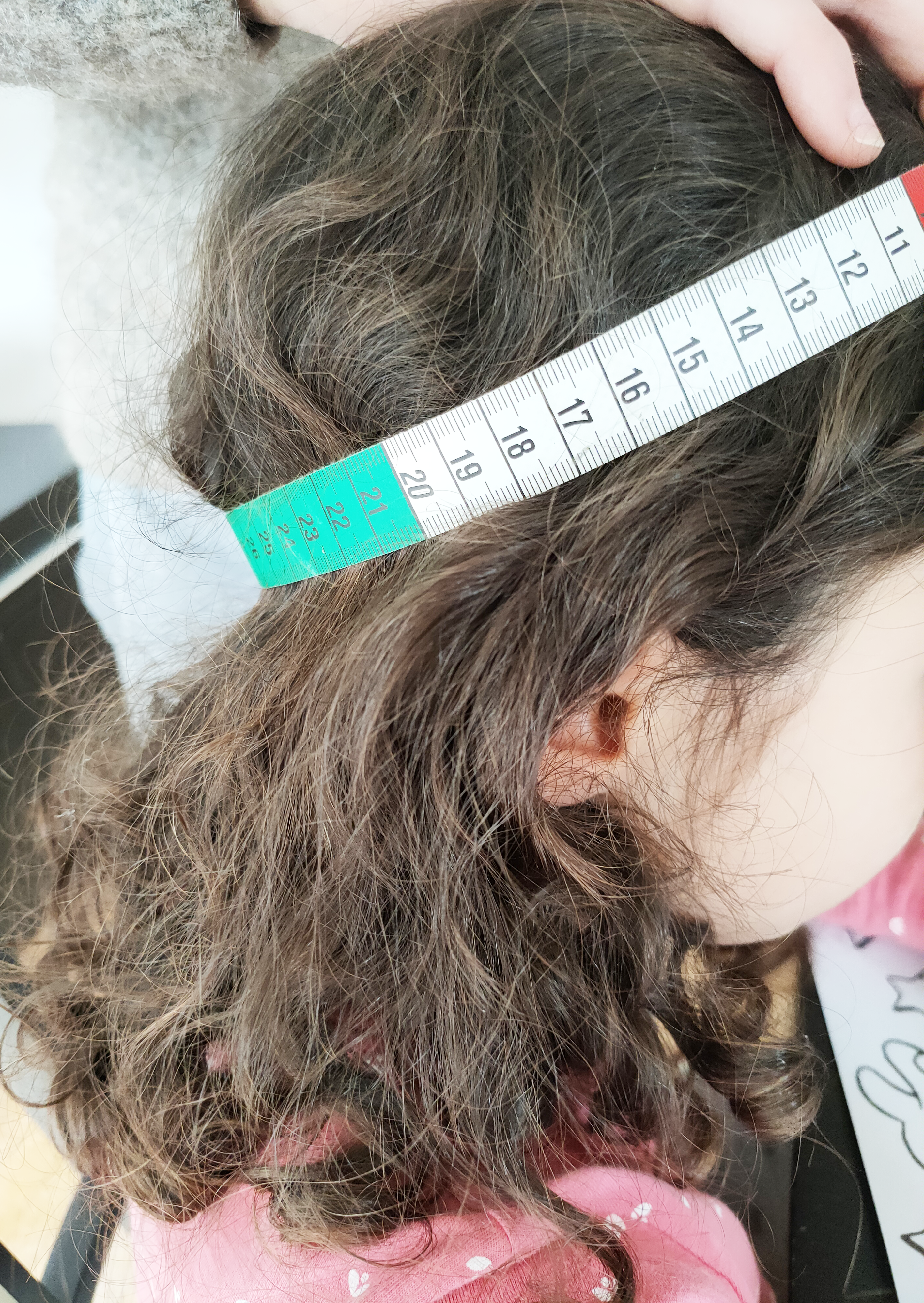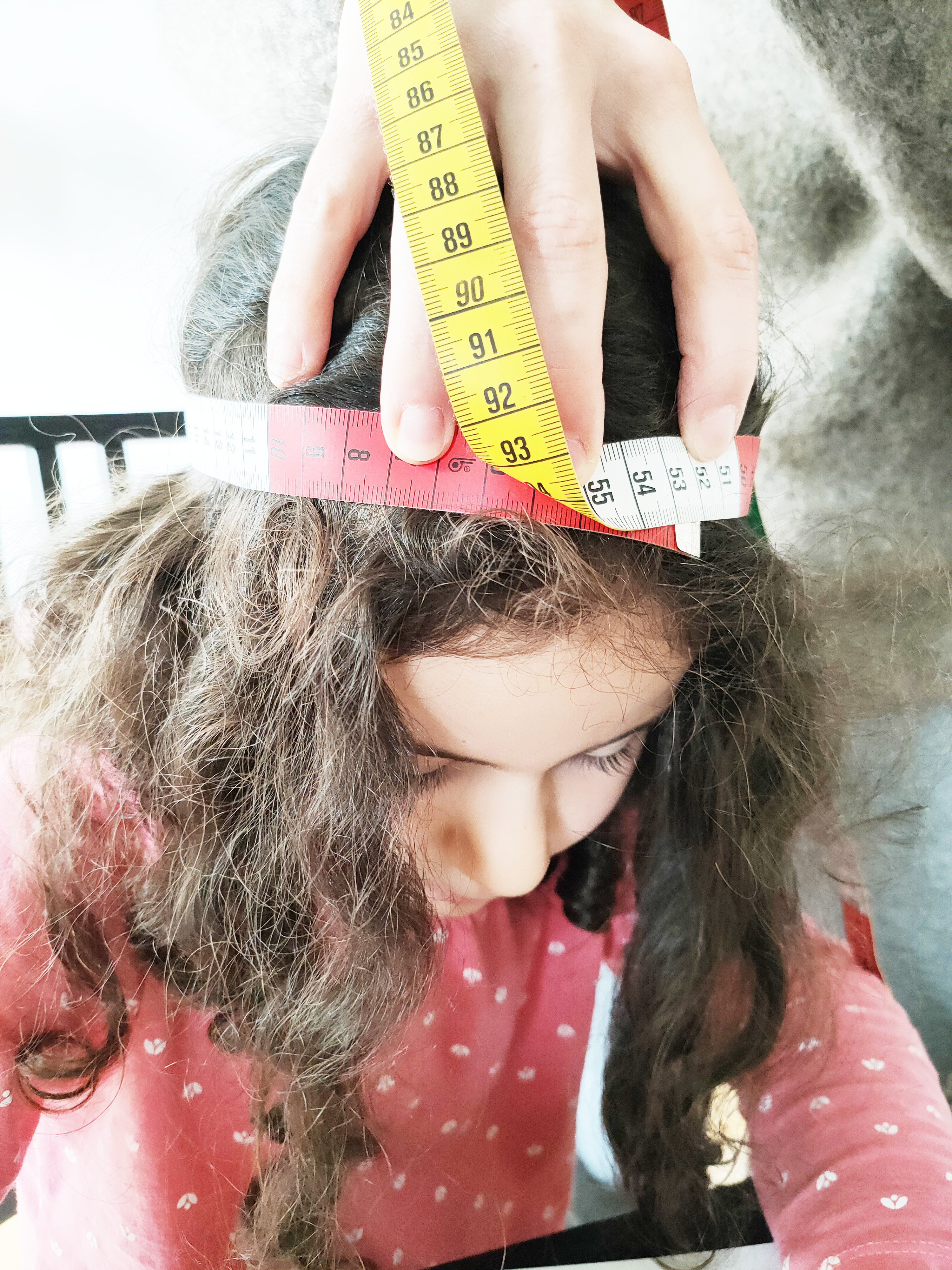 Optionnel: Créez votre patronage au préalable si la patience est votre point fort. Pour réaliser votre patron pour un accessoire de 3,5cm de large comme dans notre exemple, vous devez calculer le périmètre crânien de votre enfant. Glissez votre mètre ruban sous le cervelet de votre Loupiotte et remontez de part et d’autre de la boîte crânienne jusqu’au sommet du crâne à environ 2/3 cm de la naissance des cheveux. Et ajoutez la valeur nécessaire pour votre nœud.