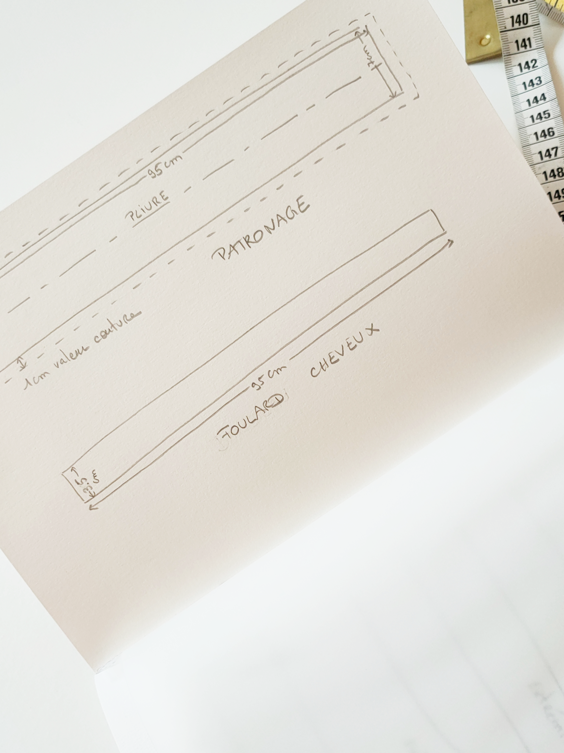 Faire un rectangle en tissu de la longueur du périmètre crânien et ajouter la valeur du nœud. La largeur est à déterminer en fonction de vos envies. Suivre les mêmes étapes que pour le patronage, indiqué ci-dessous, tout en l’appliquant directement sur votre tissu sur la face envers (afin de ne pas laisser de traces de marquage sur l’endroit du tissu)