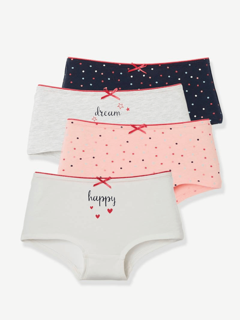 Demander l’avis des enfants sur leur préférence avant de vous lancer dans une séance shopping. Ils ont sûrement des préférences. C’est peut être un motif sur un de leurs sous vêtements qui va les motiver ou un toucher qui va les rebuter. Si vous voulez connaitre les raisons pour lesquelles votre enfant rejette l’un des ses vêtements, vous pouvez lire mon article ici. Parmi les marques de vêtements, la ligne fille comporte plus de déclinaisons dans les formes et les propositions. Dans cet article 4 formes différentes de sous-vêtements pour la fille : le shorty, le boxer, le slip, la culotte contre trois chez le garçon : slip, boxer et caleçon. Sur les couleurs, une dominante de rose chez les filles se fond dans une tendance générale girly avec des paillettes. Pour les garçons une dominante bleue et une déferlante de dinosaures cette saison.